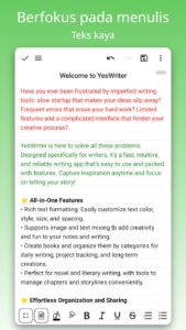 Selain membuat catatan, YesWriter juga cocok untuk menyusun konsep artikel, script, atau to-do list. Dengan fitur yang ringkas, aplikasi ini membantu menjaga tulisan tetap terorganisir tanpa ribet.
